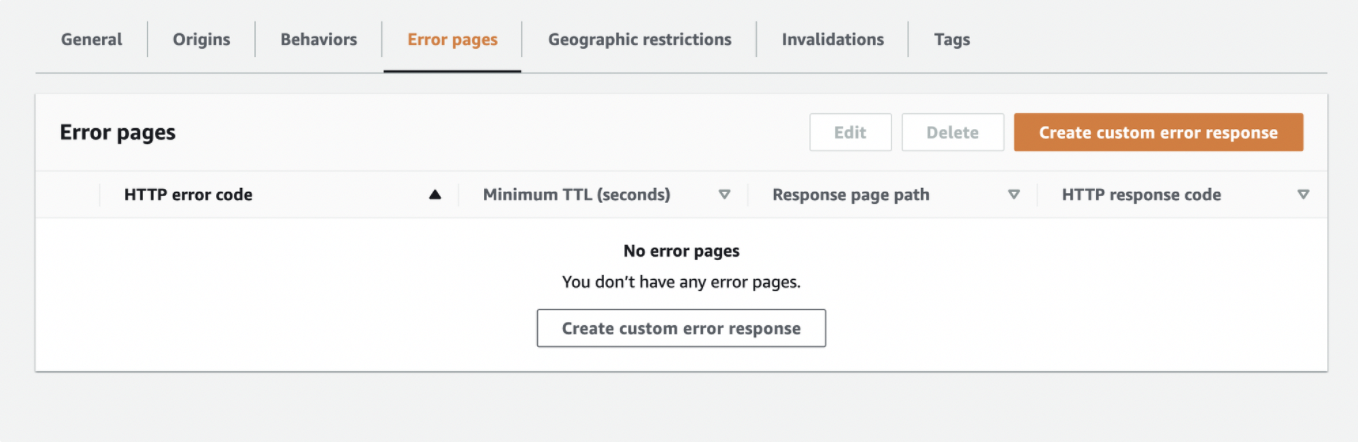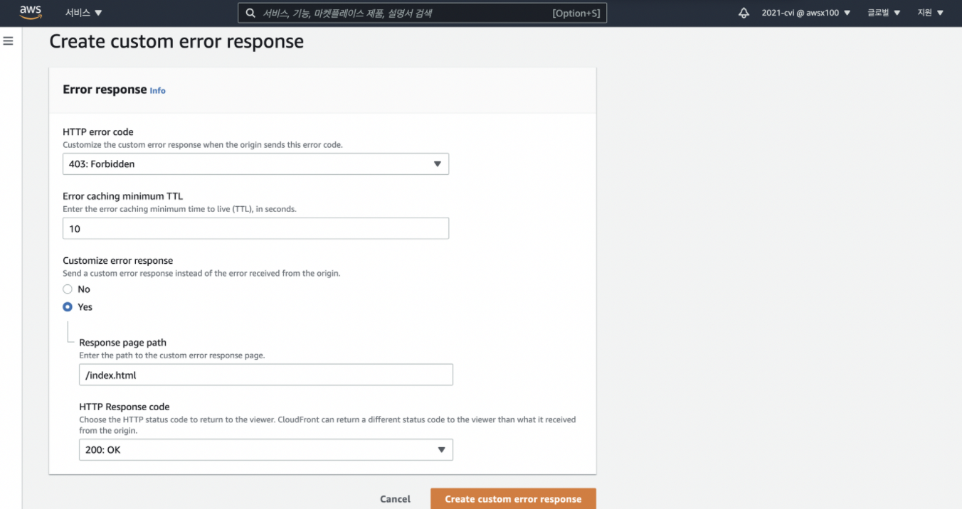 10. 본인 Distribution의 Error pages 탭으로 이동 후, Create custom error response 클릭