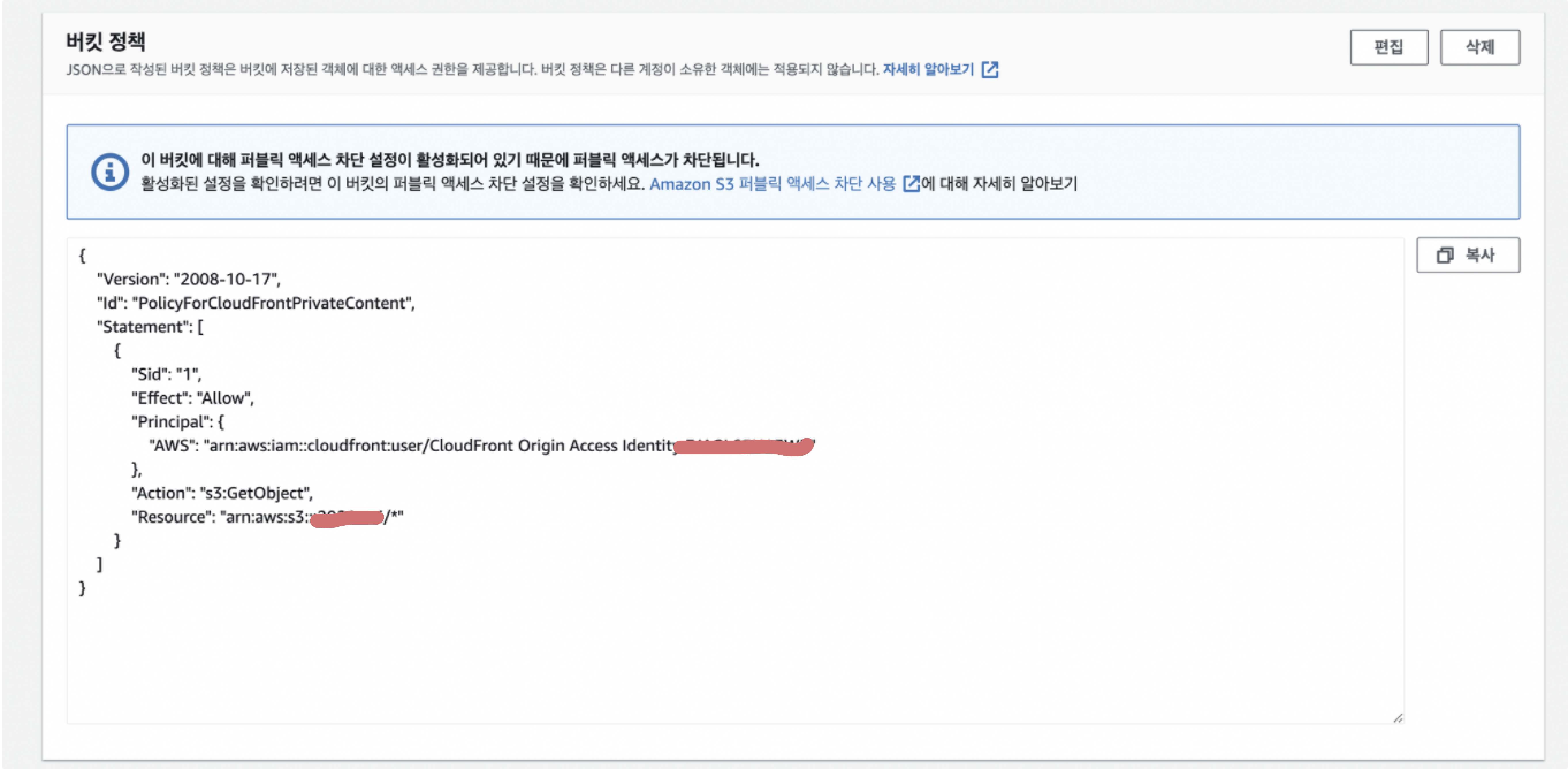 13. 잘 되면 S3 버킷 정책에 이렇게 자동으로 정책이 들어간다.