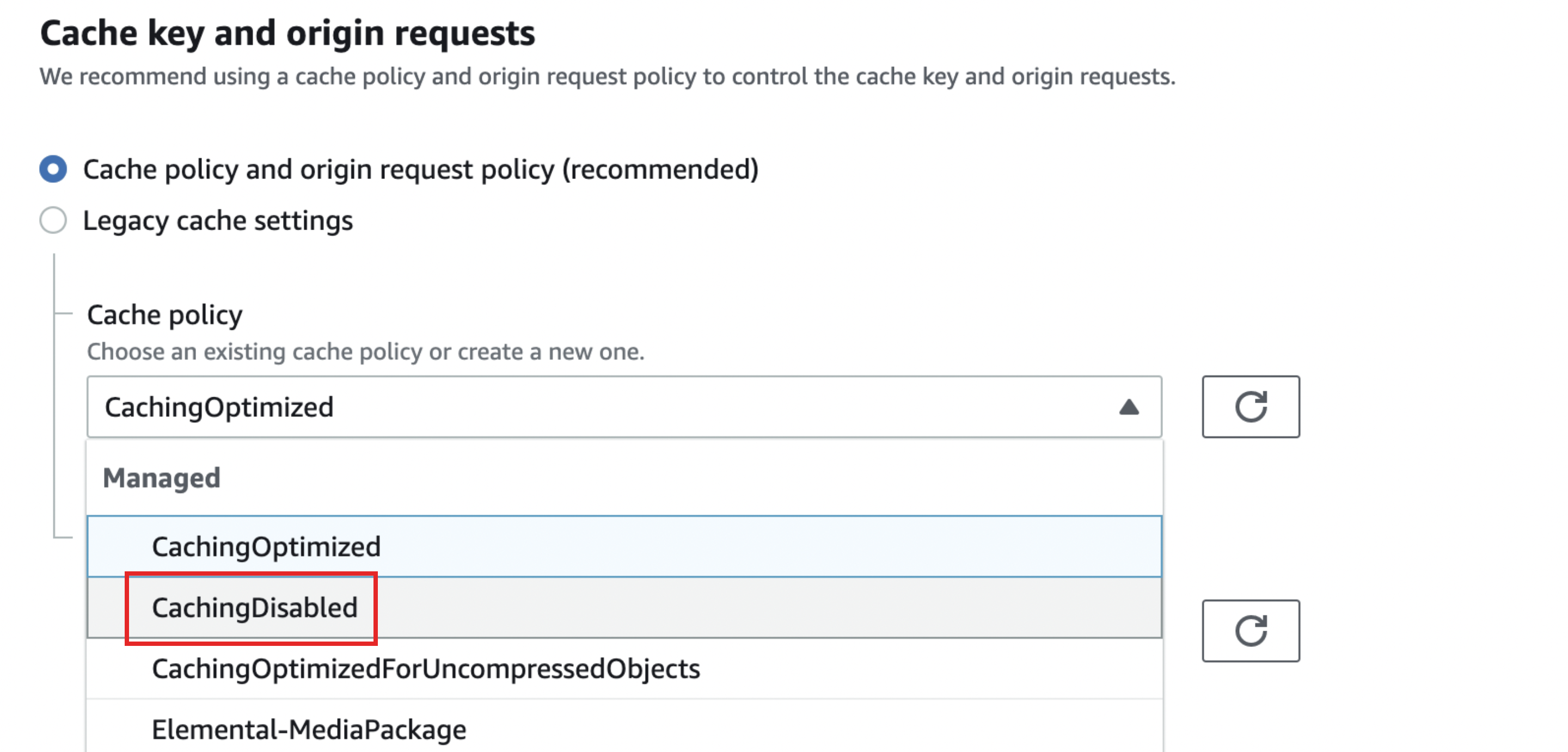 따라서 만약 dev 환경의 배포라서 변경사항을 바로바로 확인해야한다면 Cache policy에서 Caching Disabled로 해주면 된다. 이렇게 설정하면 캐싱이 아예 적용되지 않기 때문에 변경사항이 바로바로 적용되는 것을 확인할 수 있다.