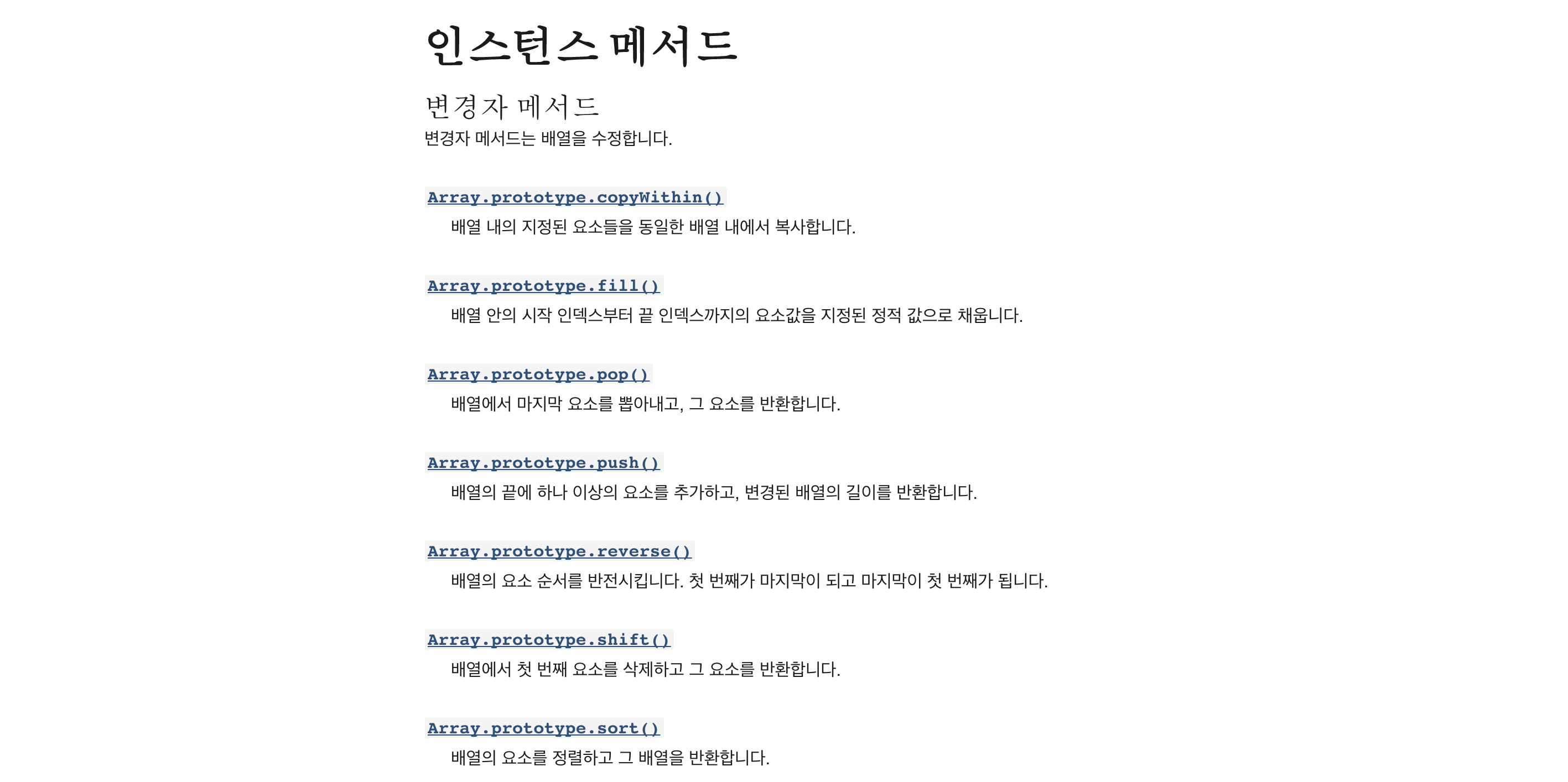 추가로 mdn의 Array파트를 보면 다음처럼 인스턴스 메서드라고 해놓고 prototype이 포함되어있는 것을 알 수 있다.(난 왜 이전까지 이 생각을 못했을까?)