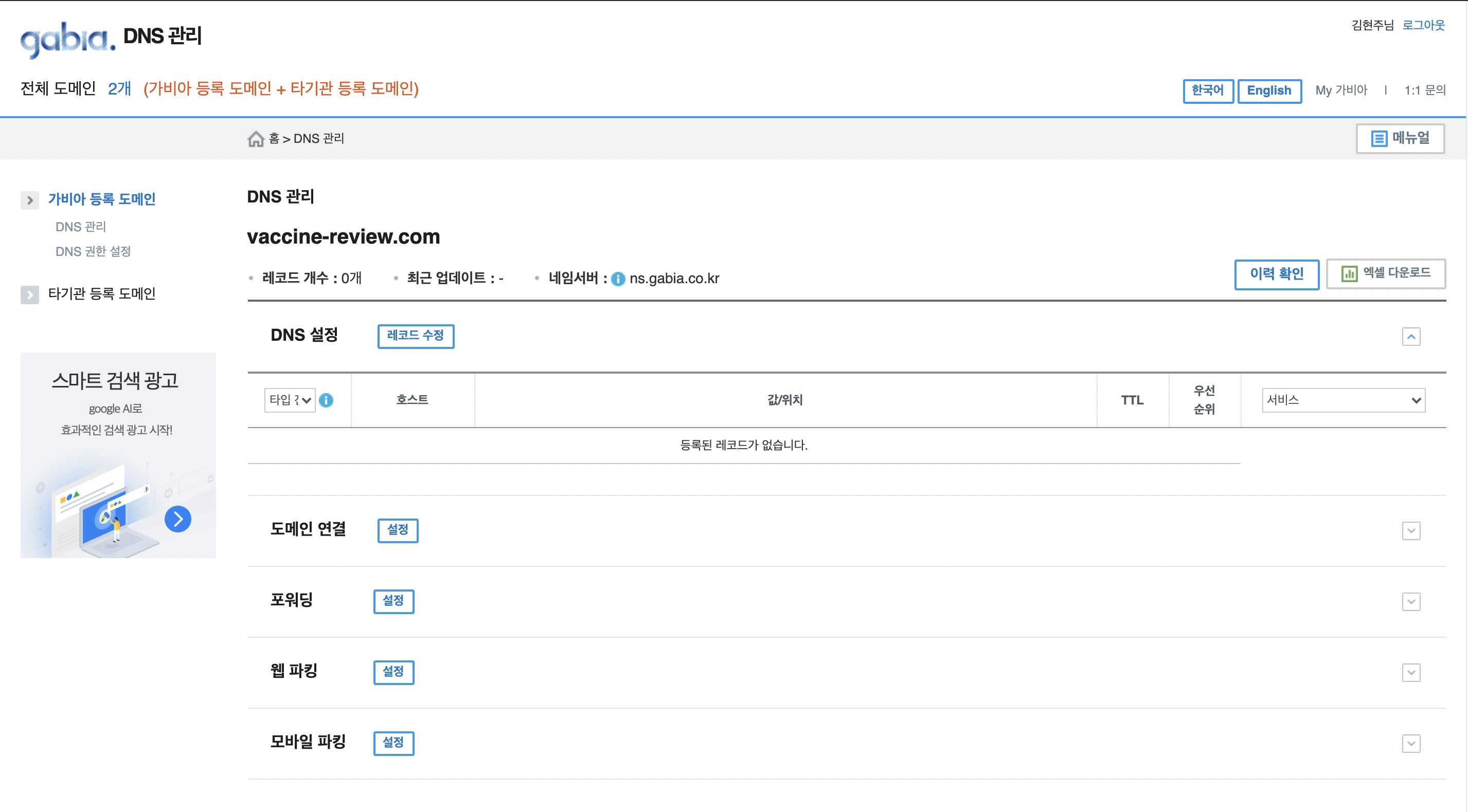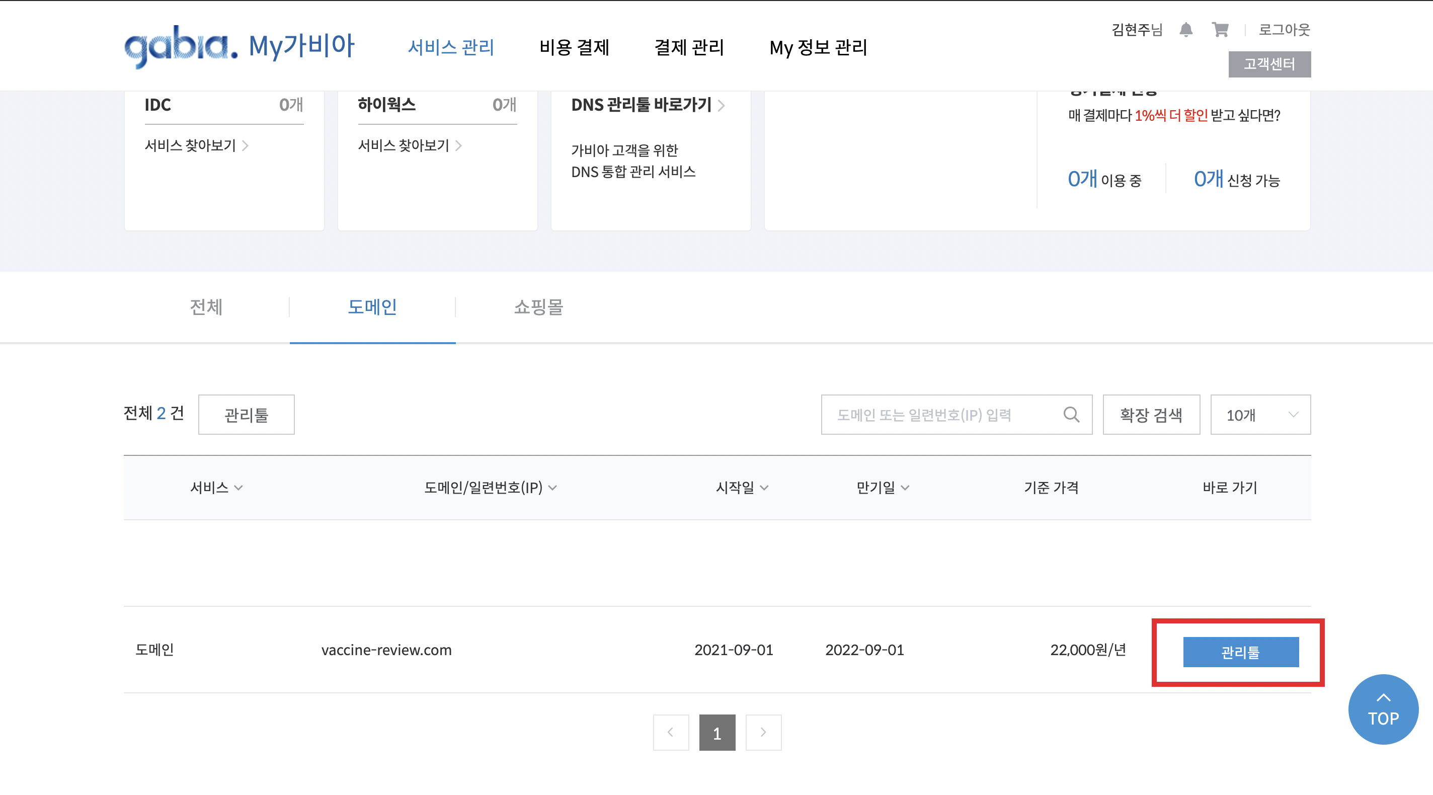 현재 백신중앙정보원이라는 백신 접종 후기를 공유하는 프로젝트를 하고 있다. 따라서 vaccine-review.com 이라는 도메인을 구입했다. 원하는 도메인 구입 후, My 가비아를 클릭해서 들어가면 도메인 구입 내역을 확인할 수 있다.