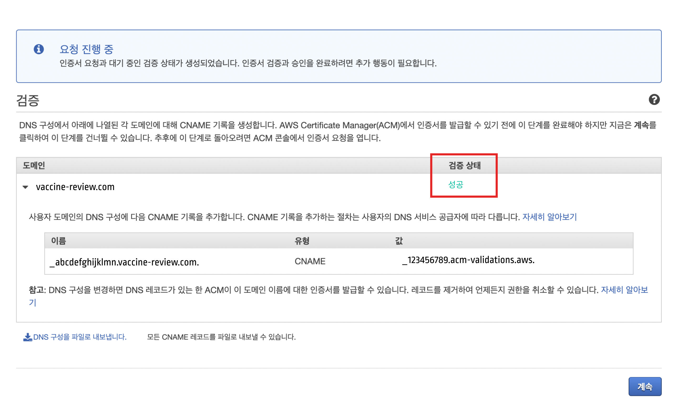 검증 보류였던 검증 상태가 성공으로 바뀌었다! 계속을 클릭한다.