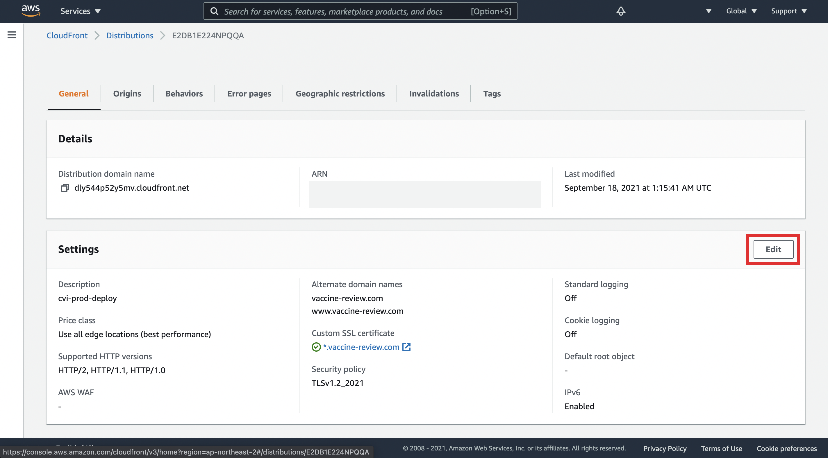 3. 내 CloudFront으로 이동 후 General 탭에서 Edit 클릭