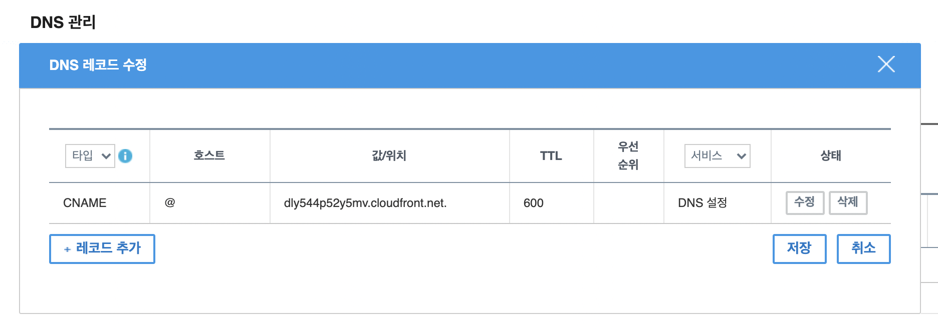 참고로 실제 클라우드 프론트 url에 추가로 . 을 꼭 붙여야한다. (안쓰고 저장하려하면 가비아에서 alert가 뜬다)
