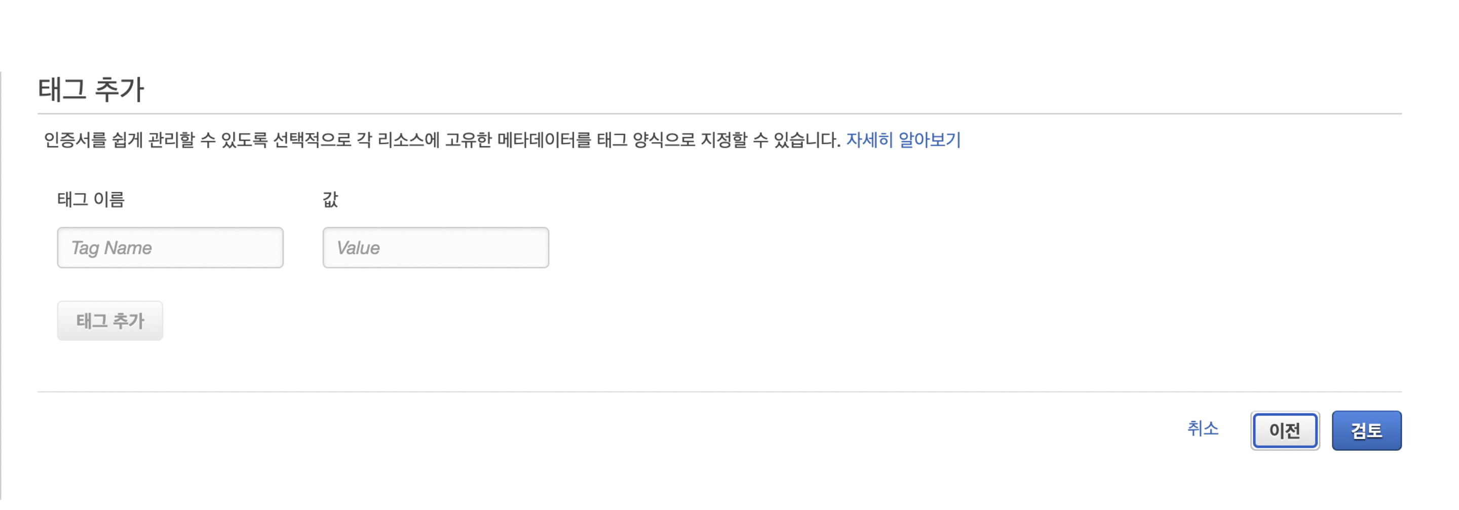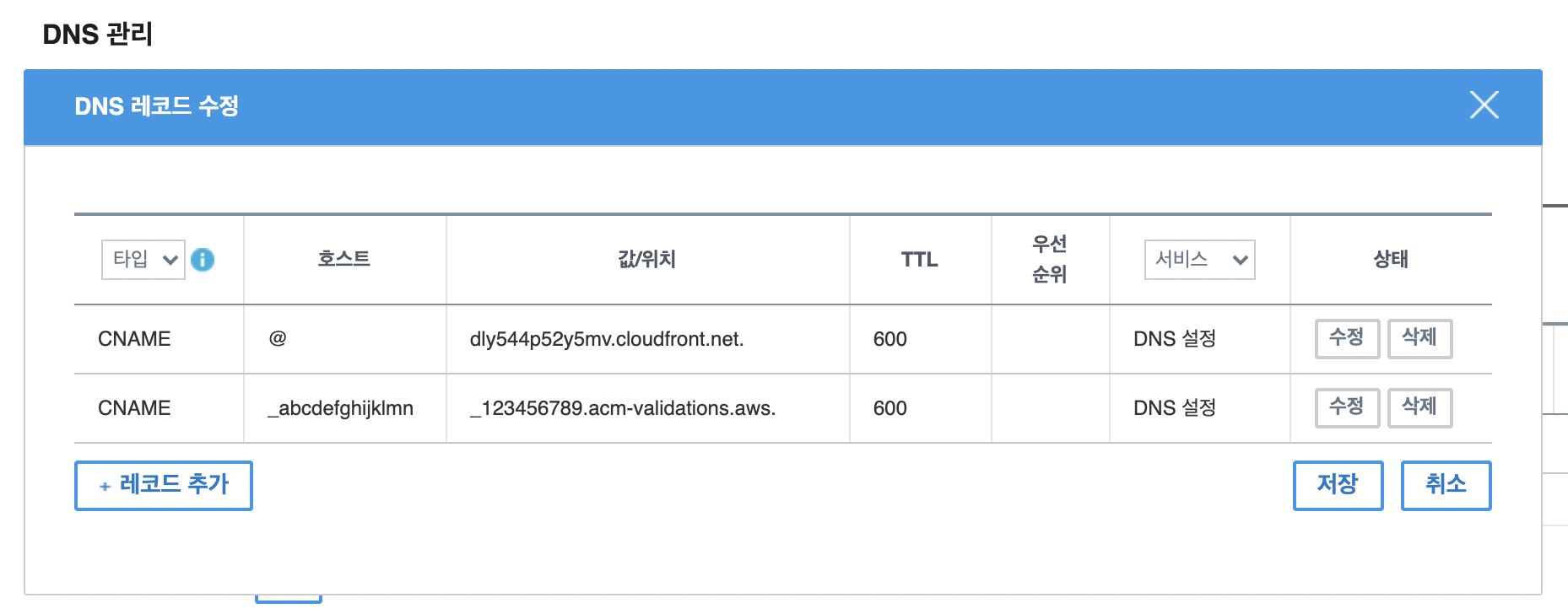 aws에서 복사한 이름 문자열은 호스트자리에, 값 문자열은 값/위치 자리에 입력한다. 호스트 자리에 넣을 때는 _abcdefghijklmn.vaccine-review.com.에서 _abcdefghijklmn 이 부분만 입력한다. 이렇게 전부 입력하고 저장하면 인증 절차가 완료된다.