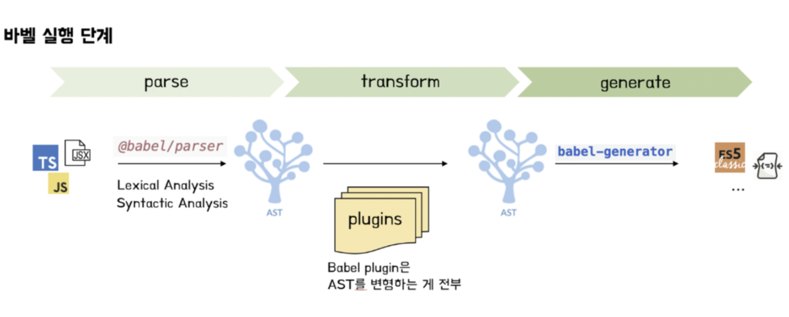 트랜스파일은 파싱, 변환, 출력 세 단계로 진행된다. 그런데 여기서 바벨은 파싱, 출력을 담당하고 변환은 바벨 플러그인이 담당한다. 바벨 플러그인이란 바벨이 어떤 코드를 어떻게 변환할지에 대한 규칙이다.