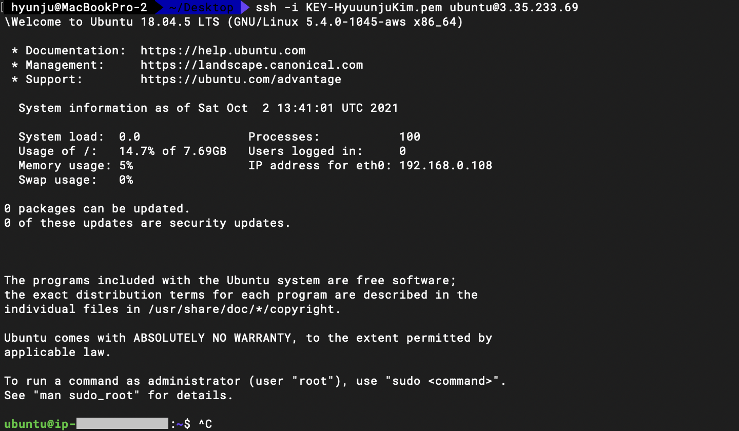 ssh -i KEY-HyuuunjuKim.pem ubuntu@3.35.233.69