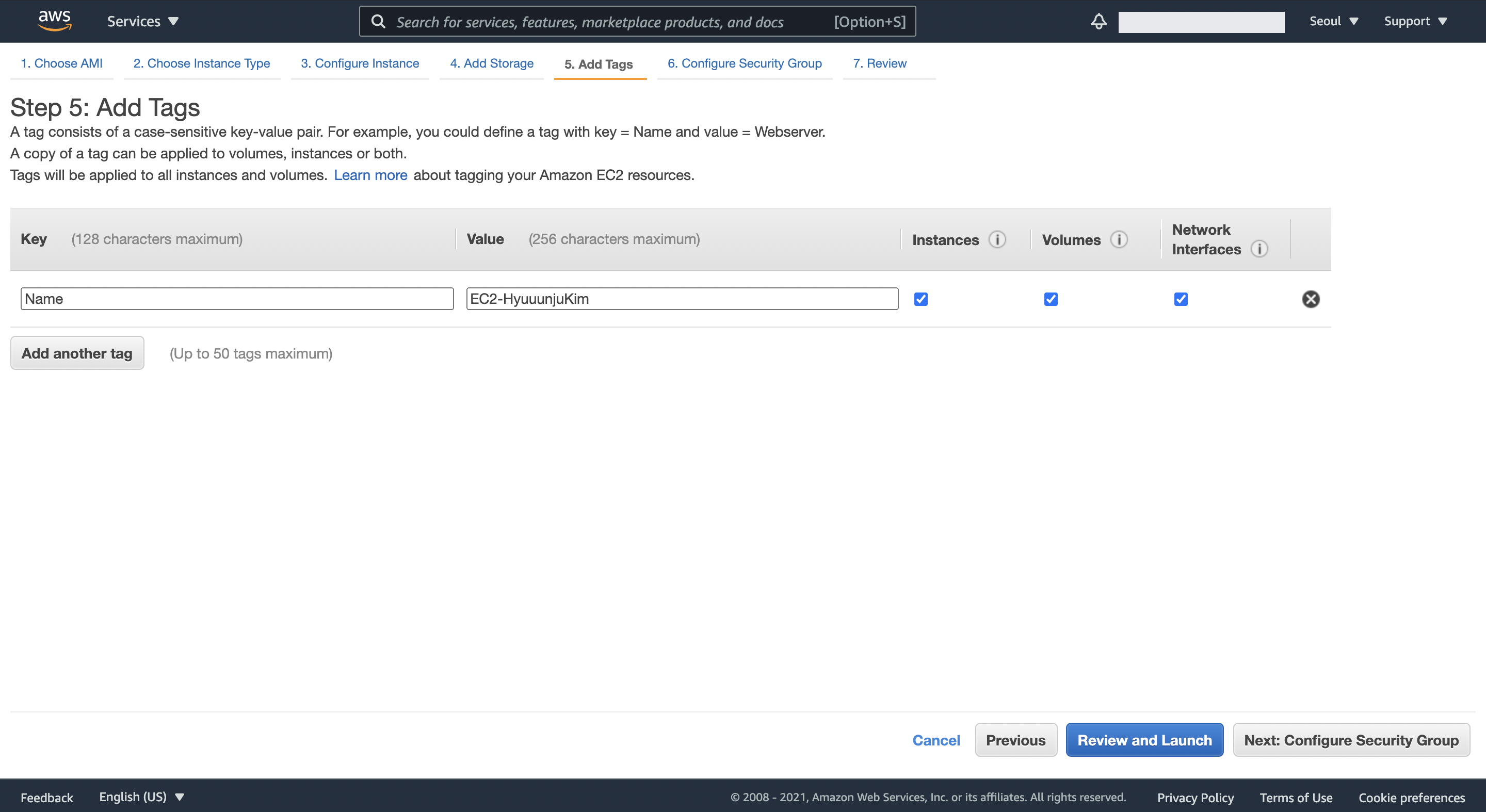 각 EC2 인스턴스에 고유하게 부여하는 데이터라고 생각하면 될 것 같다. 예를 들어 여러 EC2 인스턴스에 같은 이름의 Key와 서로 다른 이름의 Value를 부여하면, 해당 Key, Value 쌍으로 어떤 EC2인지, 누구의 소유인지 등등 여러 메타데이터를 제공할 수 있다.