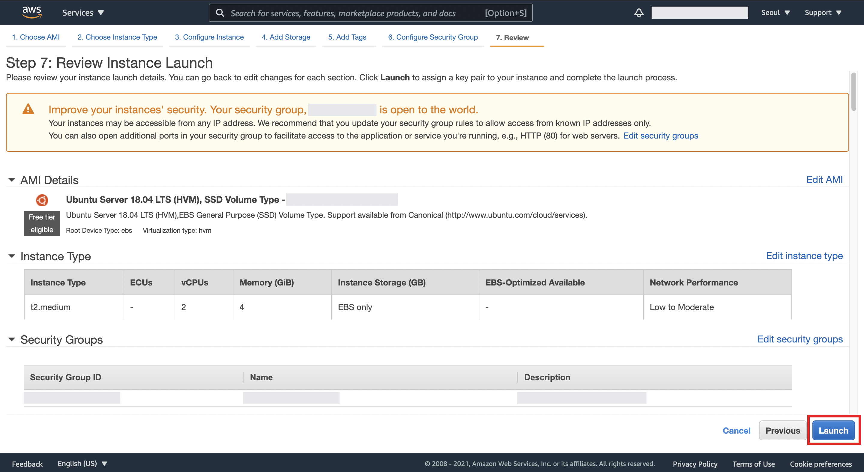 원하는 보안 그룹을 새로 생성해도 되고, 이미 존재하는 보안 그룹을 선택해도 된다. 나는 이미 존재하는 보안 그룹 중에서 선택했다.