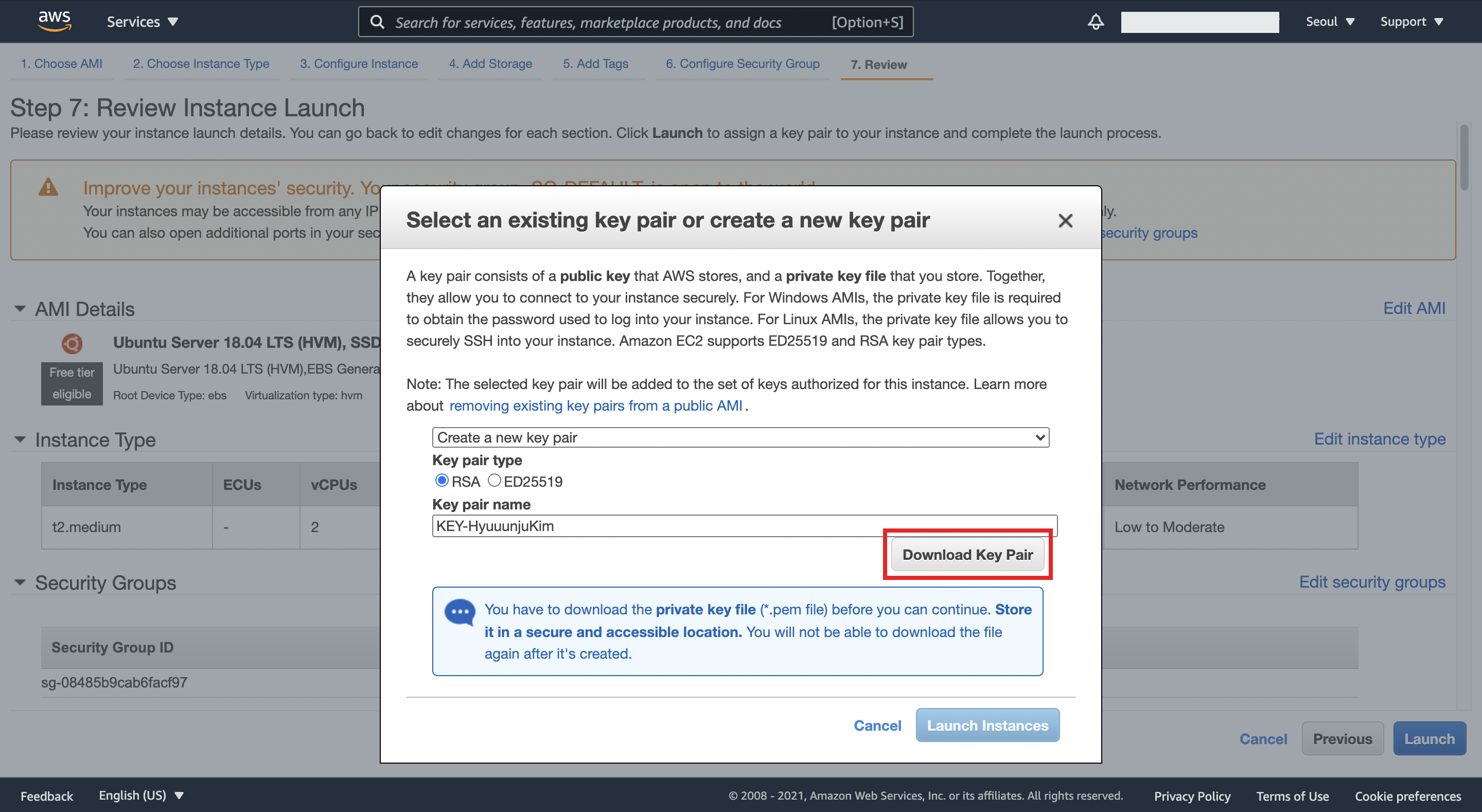 새 key pair를 생성하고, 생성된 Key Pair를 다운로드한다. 한번 다운로드 받으면 재발급이 불가능하다. 그러니깐 잘 받아서 발 보관해야한다!!!!!
