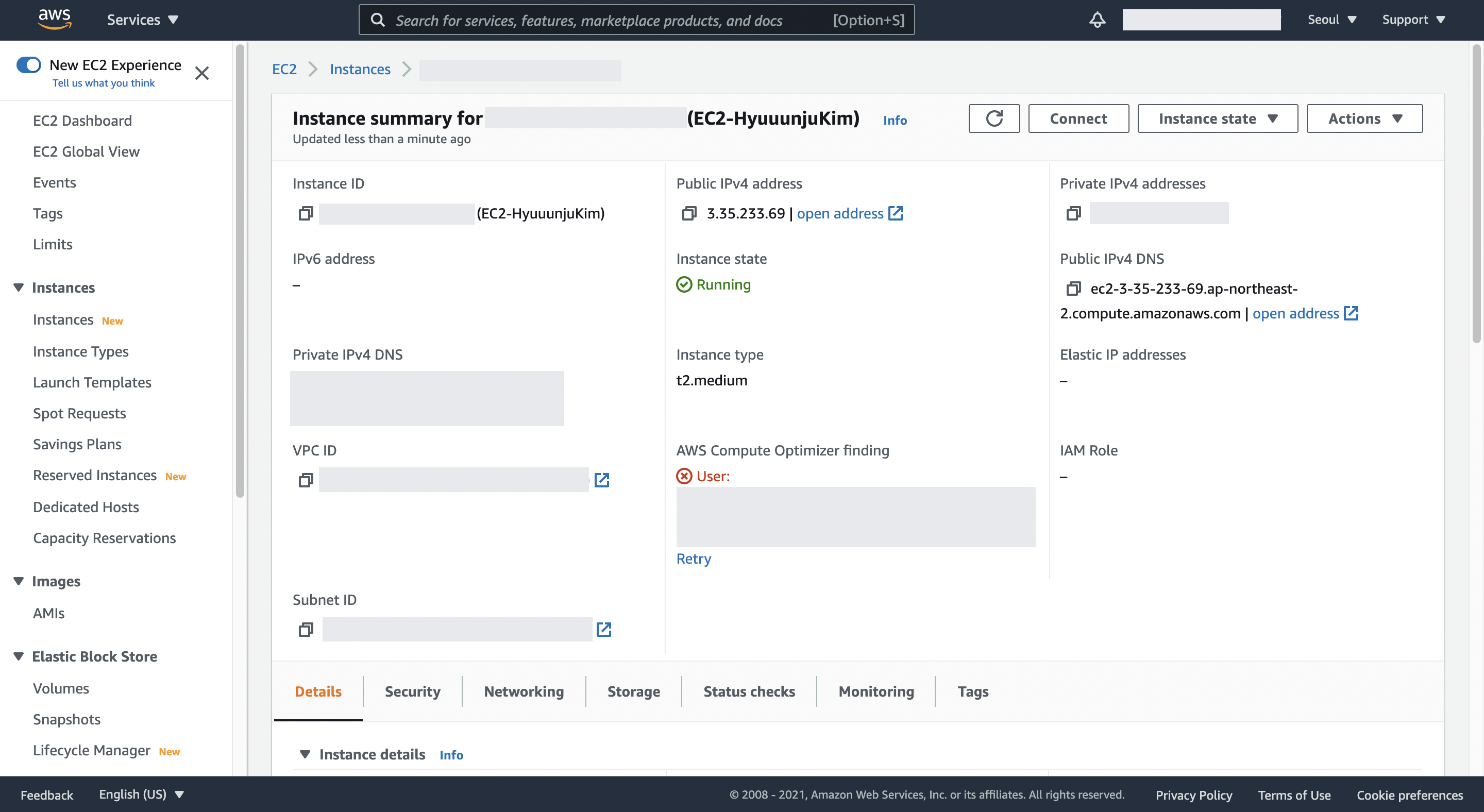 최종 생성 버튼을 누르고 EC2의 Instance 목록에서 내 Instance를 클릭해서 들어가보자. 잘 생성되었음을 알 수 있다 👍🏻